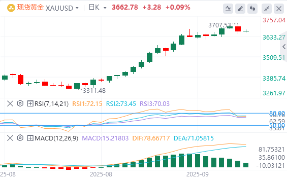 德意志银行(Deutsche Bank)等银行希望美联储在今年的所有三个会议上都将利率降低25个基点。也就是说,联邦基金利率范围为3.50%-3.75%。 黄金技术分析金价在周二暂时飙升至3,703美元的新记录 ,并在周三的3,680美元地区放弃并合并了利润。 黄金仍然有优势,重新测试有史以来最高的高价,可能上升至3,750美元和3,800美元 。